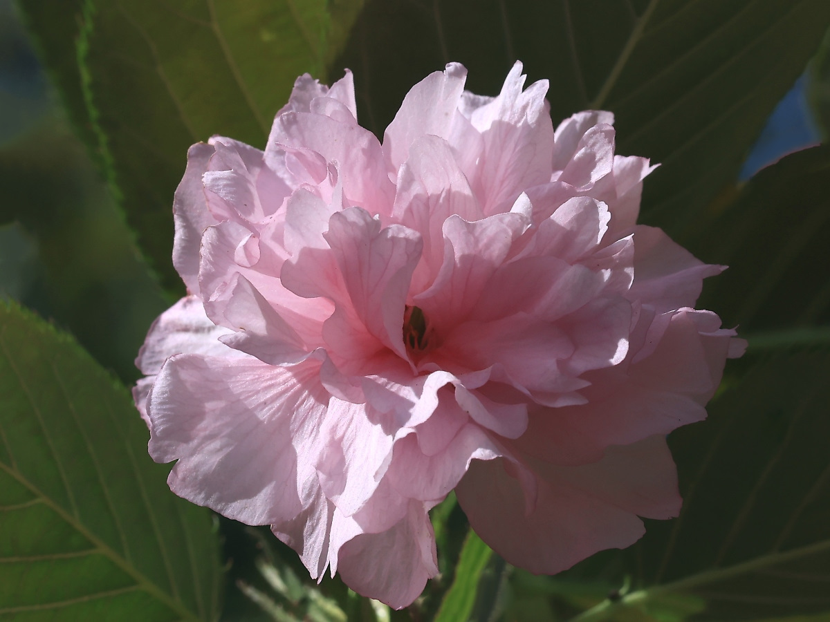MEMO: 花時期も終わりに近づいた八重桜で、花の中心の紅色が 濃くなってきており、花弁も少しくすみかけてきています