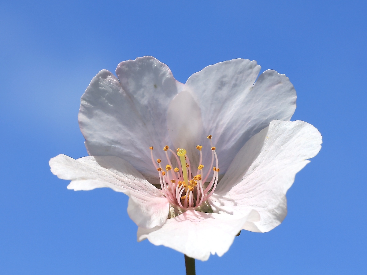 MEMO: 花時期も終わりを迎えている山桜で、雌しべ雄しべの花糸が 淡紫色になってきており、花の最後が近づいている状態です