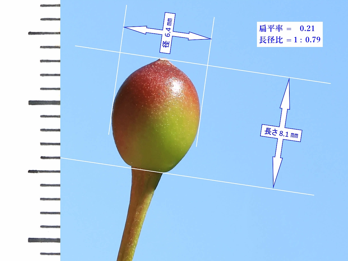 MEMO: 結実して約3週間後の山桜の実の大きさを計ったもので、長さが 8.1 ㎜、 径が 6.4 ㎜で、扁平率が 0.21 と少し球形に近い形で、赤く色づき始めた状態です