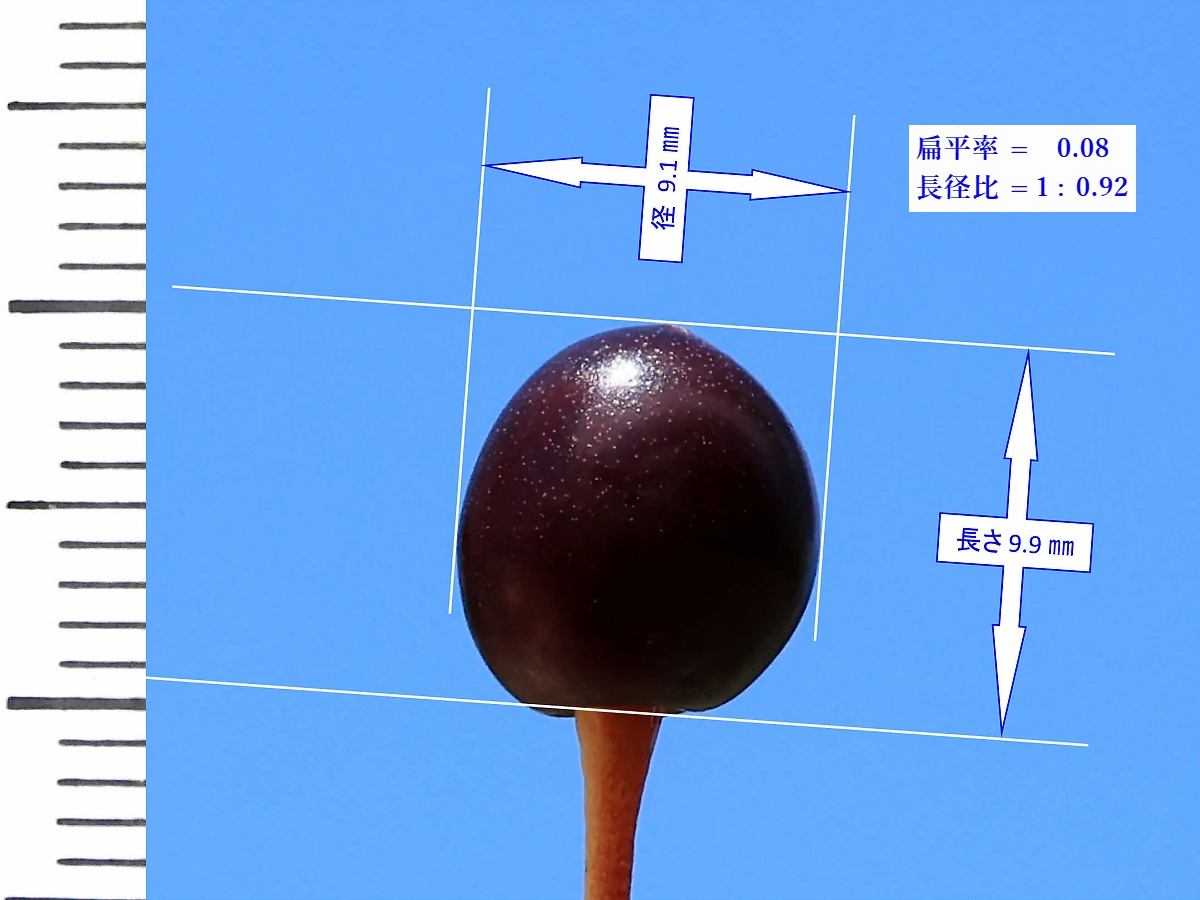 MEMO: 結実して約1ヶ月半後の山桜の実の大きさを計ったもので、 長さが 9.9 ㎜、径が 9.1 ㎜で、扁平率が 0.08 とまん丸で、少し大きくなり、 色も真っ黒になり、完熟の状態で、山桜の実としては初めて見る完熟の実です