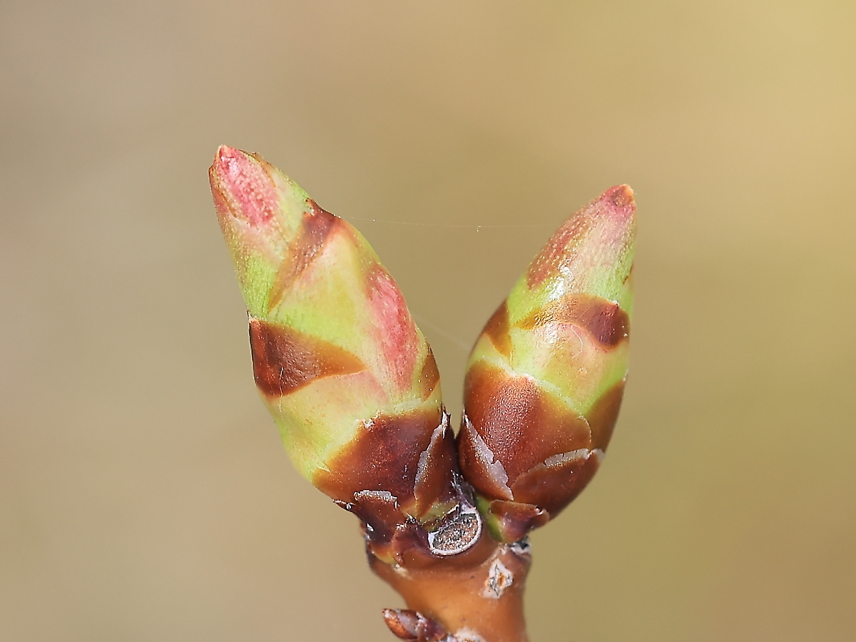 MEMO: 冬芽の膨らみが更に増し、先端の黄緑色や紅色がはっきり見え、 左の冬芽は先端がかすかに開き始めている状態です