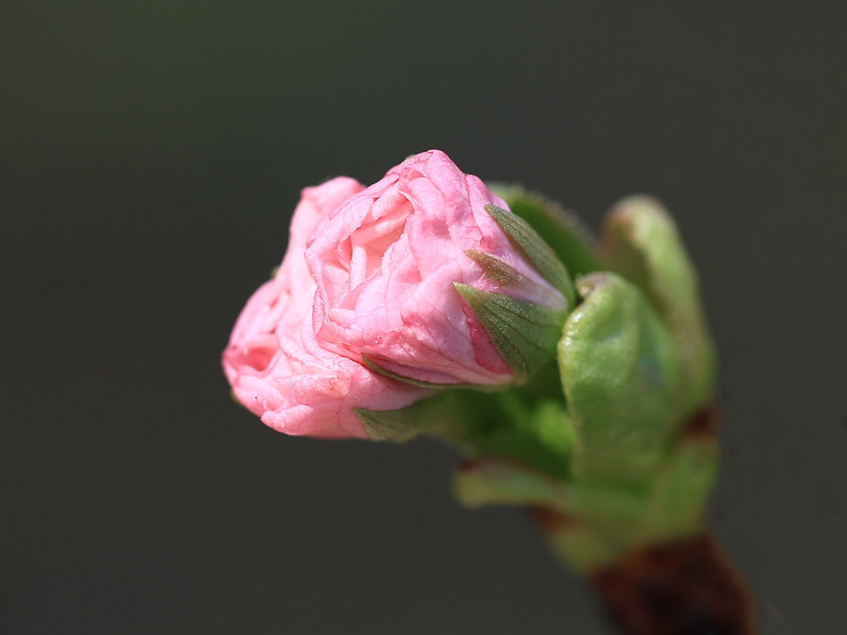 MEMO: 花芽から2個の蕾が出揃ったところで、紅色の花弁の 先端が開き始めており、開花が近いことを窺わせている状態です