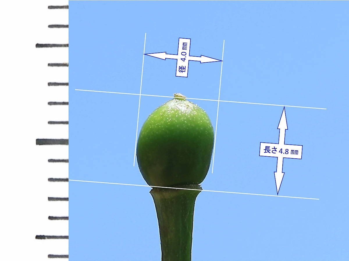 MEMO: 結実したばかりの楊貴妃の実で、大きさは長さが 4.8 ㎜、径が 4.0 ㎜と 小さく緑色をした可愛い実で、八重咲きの楊貴妃が結実するのは珍しいことです