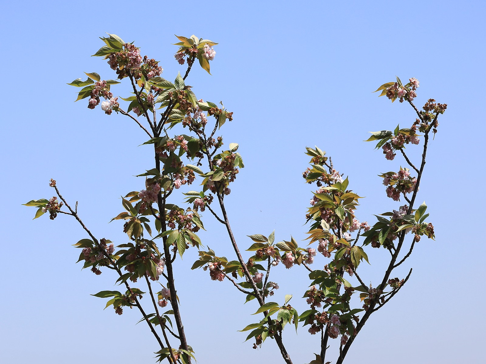 MEMO: 花時期も終わりを迎えた楊貴妃の全体像で、 茶色がかった緑色の若葉が広がり始め葉桜へと変わりつつある姿です