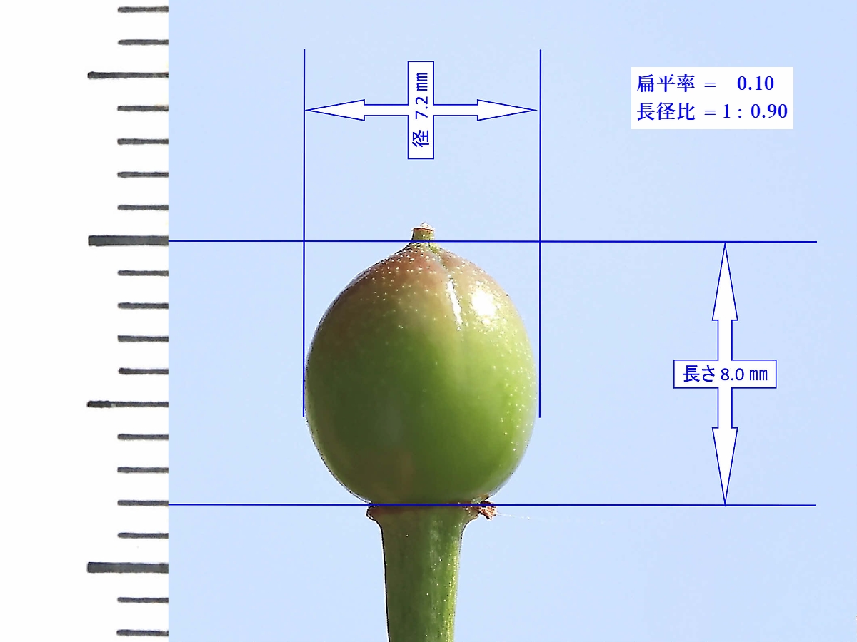 MEMO: 結実して間もない頃の楊貴妃の実の大きさを計ったもので、 長さが 8.0 ㎜、径が 7.2 ㎜で、扁平率が 0.10 とほぼ球形で、 まだ緑色をしており、これから先どこまで熟すかが楽しみです