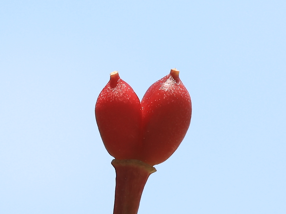 MEMO: 結実して約2週間後の楊貴妃の双子の実で、この大きさでもう真っ赤に なっており、これ以上は大きくならず、まもなく落果してしまうと思われます