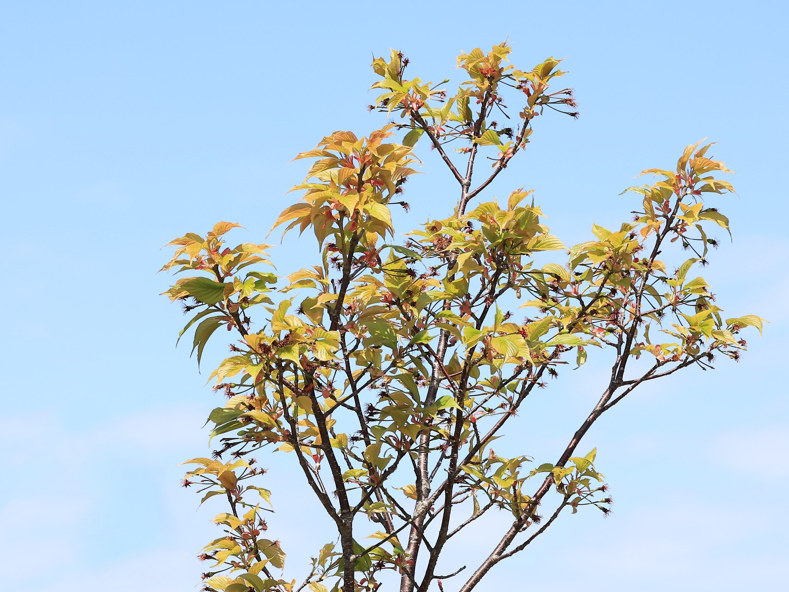 MEMO: 花時期の終了を迎えた陽光で、茶色がっかた 黄緑色の若葉が広がり、葉桜へと変わりつつある状態です