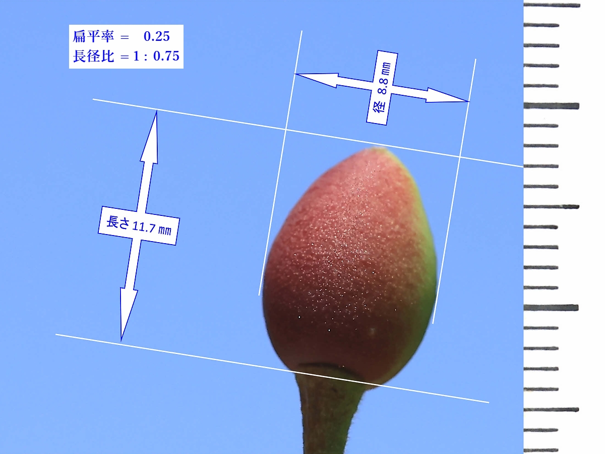 MEMO: 結実して約3週間後の陽光の実の大きさを計ったもので、 長さが 11.7 ㎜で、径が 8.8 ㎜で、扁平率が 0.25 と随分大きくなり、 かなり細長かった形も少し膨らみ、色づき始めてきた状態です