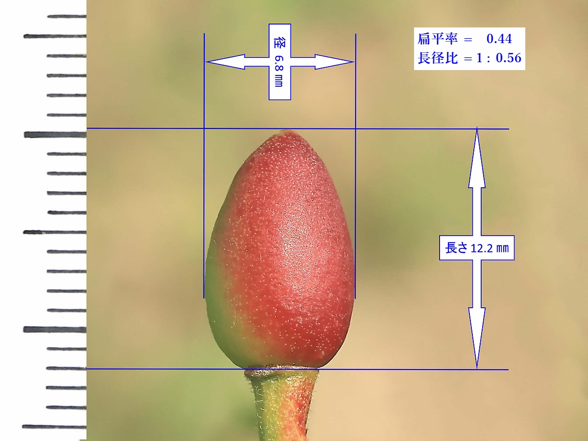 MEMO: 結実して約1ヶ月後の陽光の実の大きさを計ったもので、 長さが 12.2 ㎜、径が 6.8 ㎜で、扁平率が 0.44 と陽光の実の 最大の特徴である細長い形をしており、色づき始めてきた状態です